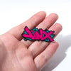 • Jinx Graffiti Pin: Features Jinx's unmistakable pink graffiti tag with dynamic blue glitter accents, measuring approximately 5.0cm (1.97in) in width and 2.5cm (0.98in) in height, weighing 6.44g (0.23oz).